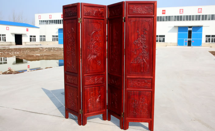 江蘇中尊木業有限公司屏風系列產品:梅蘭竹匊掛屏、四季花折屏四件套等。